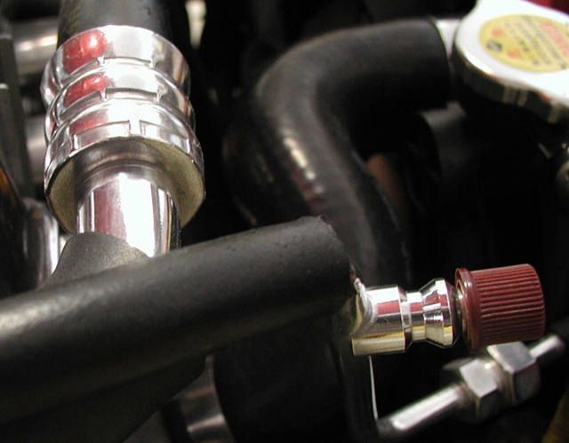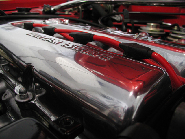 | Can you tell I like the shiny stuff? | Peeking out at the back of the valve cover is my Zoops billet PCV valve | The A/C lines are hand polished. | These are the old Magnecor wires |